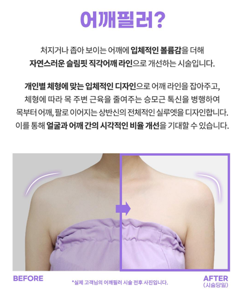 어깨필러는 단순히 "넓게 만드는 시술"이 아니라 상체 비율을 조율하는 접근 방법 중 하나입니다. 과한 변화보다 자연스러운 라인 연결을 우선으로 개인 체형에 맞춘 방향을 안내드립니다. 상담 전 충분한 정보 확인과 신중한 판단을 통해 진행해보시면 좋을 거 같습니다~! * 시술의 결과는 개인차가 있습니다. * 모든 시술은 부작용 가능성이 있으므로 충분한 상담이 필요합니다. |